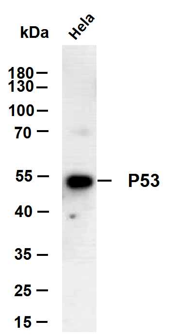Hela whole cell lysates were separated by 10% SDS-PAGE, and the membrane was blotted with anti-P53(ABT002) antibody. The HRP-conjugated Goat anti-Mouse IgG(H + L) antibody was used to detect the antibody.Lane 1: HelaPredicted band size: 53kDaObserved band size: 53kDa