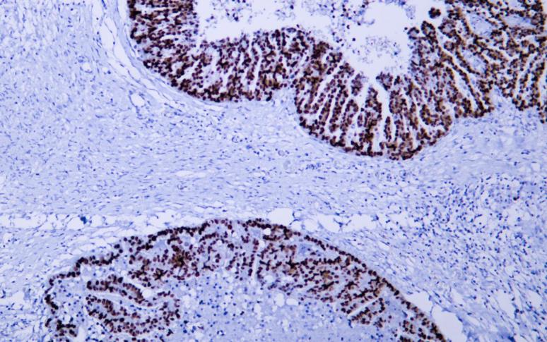 Human ovarian serous adenocarcinoma tissue was stained with Anti-P53 (ABT002) Antibody