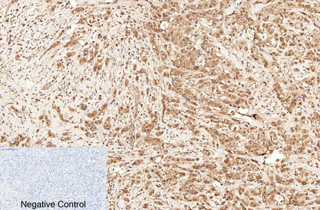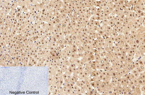 Immunohistochemical analysis of paraffin-embedded Human-liver tissue. 1,Caspase-7 Polyclonal Antibody was diluted at 1:200(4°C,overnight). 2, Sodium citrate pH 6.0 was used for antibody retrieval(>98°C,20min). 3,Secondary antibody was diluted at 1:200(room tempeRature, 30min). Negative control was used by secondary antibody only.
