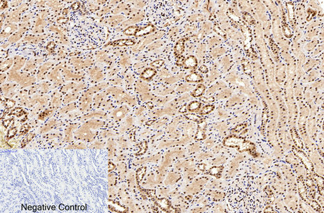Immunohistochemical analysis of paraffin-embedded Human-kidney tissue. 1,Caspase-7 Polyclonal Antibody was diluted at 1:200(4°C,overnight). 2, Sodium citrate pH 6.0 was used for antibody retrieval(>98°C,20min). 3,Secondary antibody was diluted at 1:200(room tempeRature, 30min). Negative control was used by secondary antibody only.