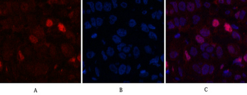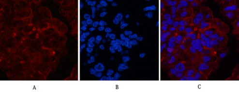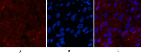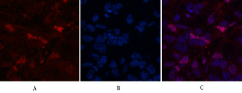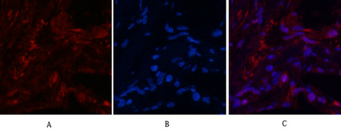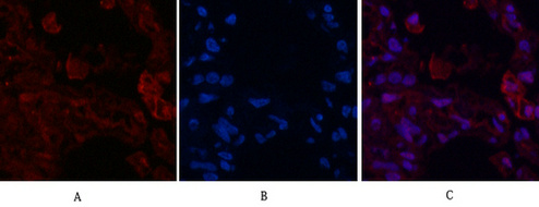 Immunofluorescence analysis of Human-breast-cancer tissue. 1,Caspase-7 Polyclonal Antibody(red) was diluted at 1:200(4°C,overnight). 2, Cy3 labled Secondary antibody was diluted at 1:300(room temperature, 50min).3, Picture B: DAPI(blue) 10min. Picture A:Target. Picture B: DAPI. Picture C: merge of A+B