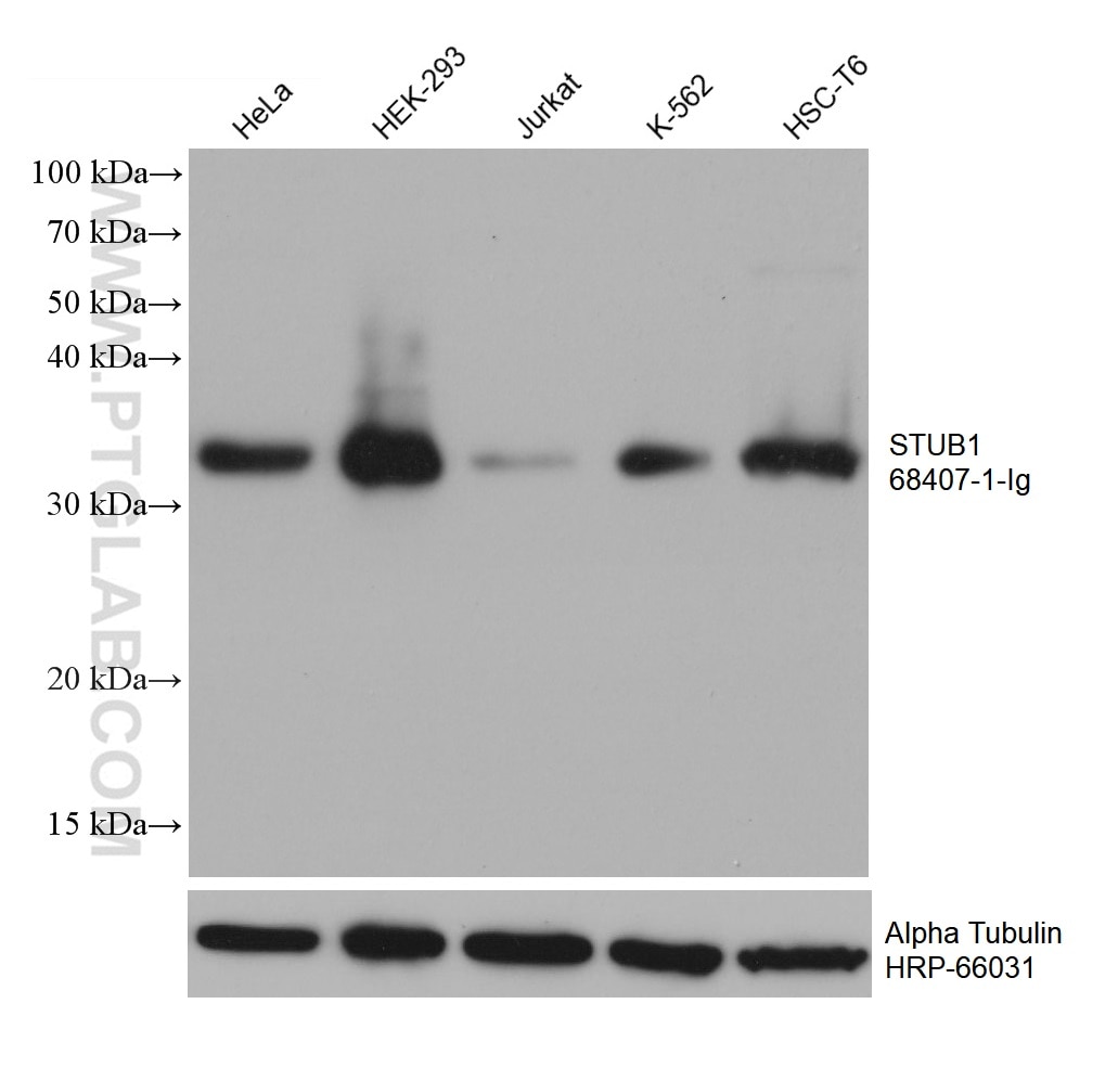 The STUB1 antibody from Proteintech is a mouse monoclonal antibody to a peptide of human STUB1. This antibody recognizes human, rat antigen. The STUB1 antibody has been validated for the following applications: WB, IF/ICC, ELISA analysis.