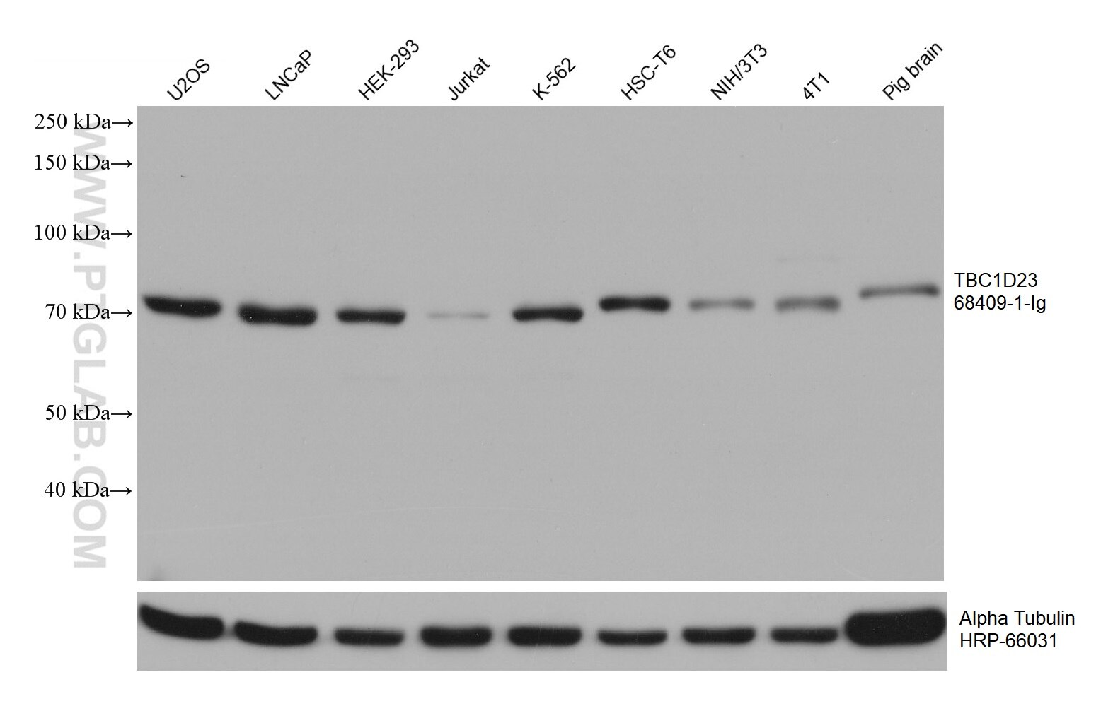 The TBC1D23 antibody from Proteintech is a mouse monoclonal antibody to a recombinant protein of human TBC1D23. This antibody recognizes human, mouse, rat, pig antigen. The TBC1D23 antibody has been validated for the following applications: WB, ELISA analysis.