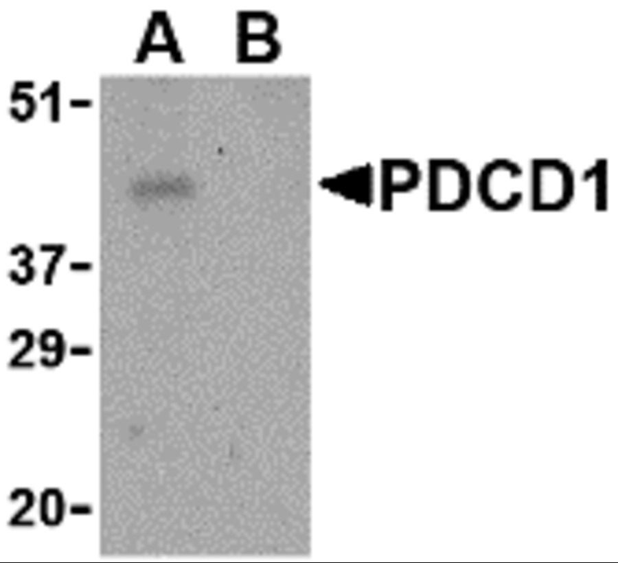 Western blot analysis of PD-1 in THP-1 cell lysate with PD-1 antibody at 1 μg/mL in the (A) absence and (B) presence of blocking peptide.