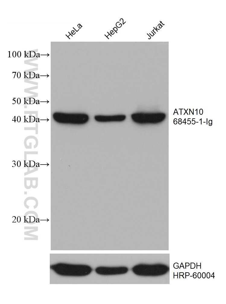 The ATXN10 antibody from Proteintech is a mouse monoclonal antibody to a recombinant protein of human ATXN10. This antibody recognizes human antigen. The ATXN10 antibody has been validated for the following applications: WB, ELISA analysis.