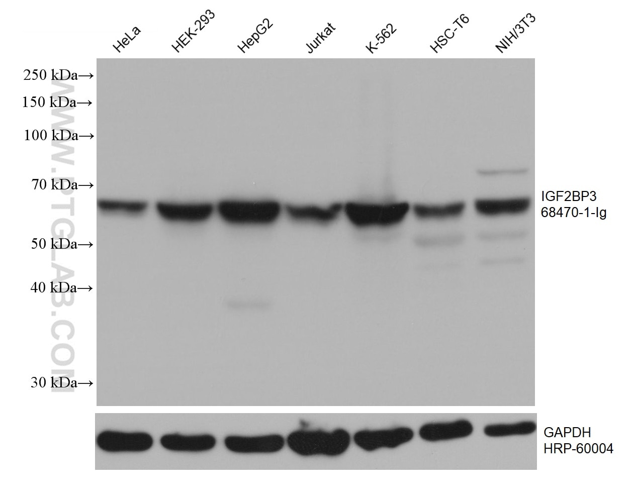 The IGF2BP3 antibody from Proteintech is a mouse monoclonal antibody to a recombinant protein of human IGF2BP3. This antibody recognizes human, mouse, rat antigen. The IGF2BP3 antibody has been validated for the following applications: WB, ELISA analysis.