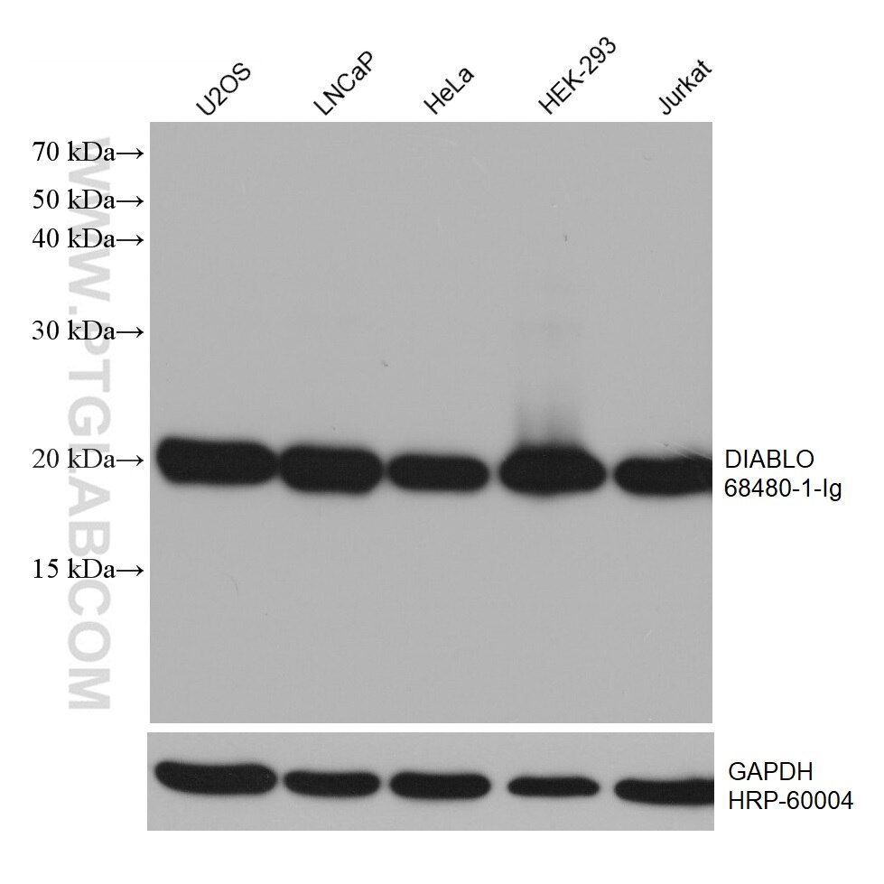The Smac/DIABLO antibody from Proteintech is a mouse monoclonal antibody to a recombinant protein of human Smac/DIABLO. This antibody recognizes human, rat antigen. The Smac/DIABLO antibody has been validated for the following applications: WB, IF/ICC, ELISA analysis.