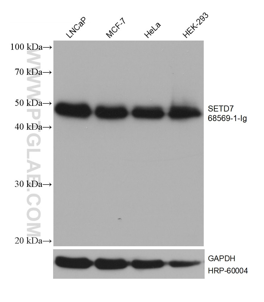 The SETD7 antibody from Proteintech is a mouse monoclonal antibody to a recombinant protein of human SETD7. This antibody recognizes human, mouse, rat antigen. The SETD7 antibody has been validated for the following applications: WB, ELISA analysis.