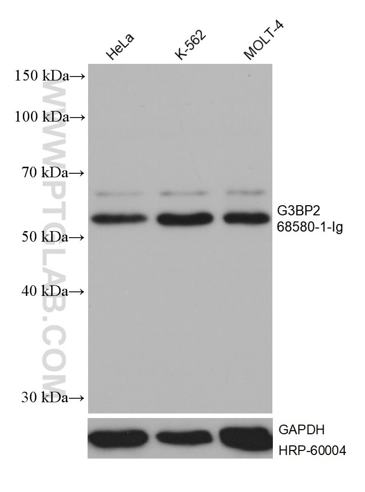 The G3BP2 antibody from Proteintech is a mouse monoclonal antibody to a recombinant protein of human G3BP2. This antibody recognizes human, rat antigen. The G3BP2 antibody has been validated for the following applications: WB, IF/ICC, ELISA analysis.