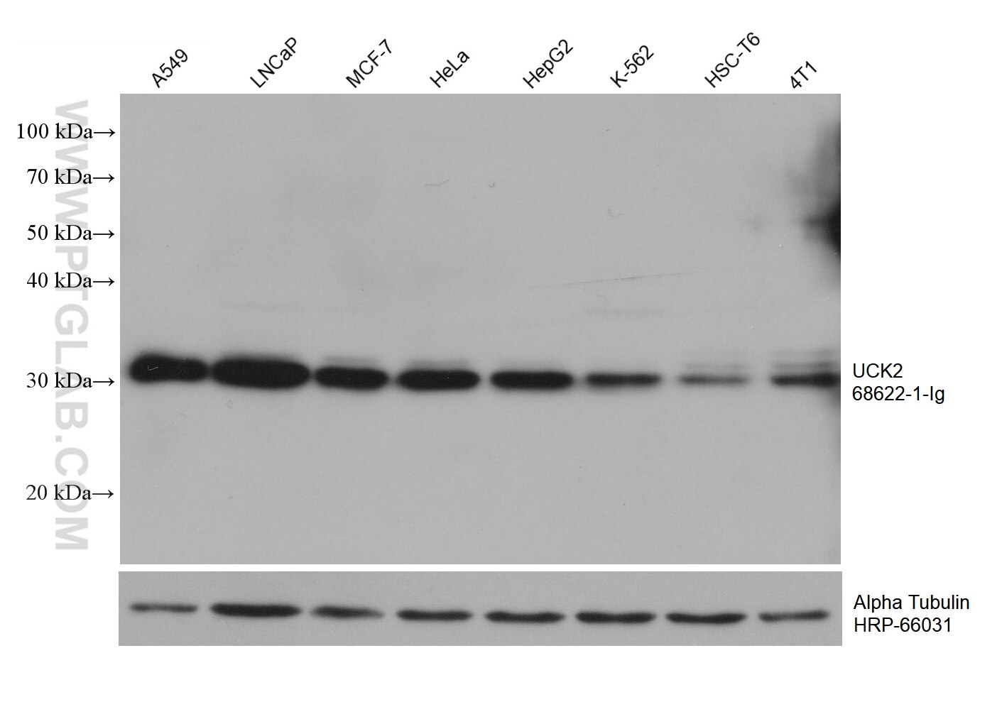 The UCK2 antibody from Proteintech is a mouse monoclonal antibody to a recombinant protein of human UCK2. This antibody recognizes human, mouse, rat antigen. The UCK2 antibody has been validated for the following applications: WB, ELISA analysis.