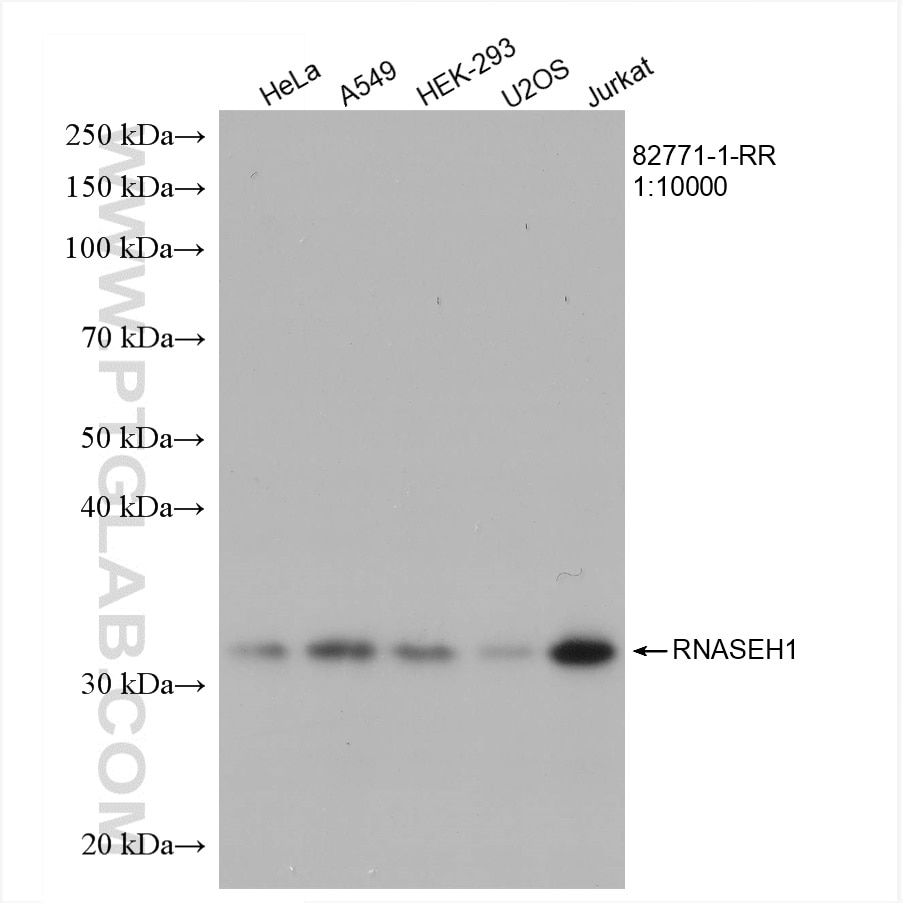 The RNASEH1 antibody from Proteintech is a rabbit recombinant antibody to a recombinant protein of human RNASEH1. This antibody recognizes human antigen. The RNASEH1 antibody has been validated for the following applications: WB, IHC, ELISA analysis.