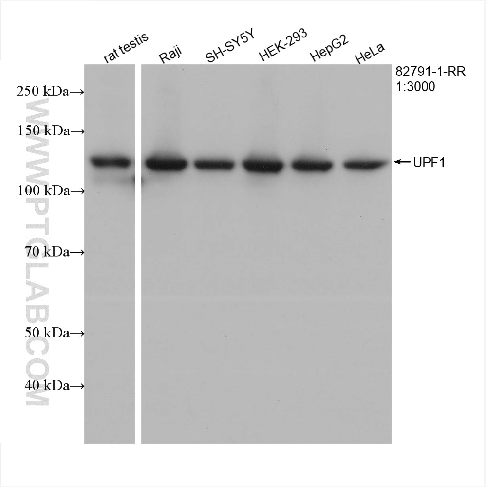The UPF1 antibody from Proteintech is a rabbit recombinant antibody to a recombinant protein of human UPF1. This antibody recognizes human, rat antigen. The UPF1 antibody has been validated for the following applications: WB, IF/ICC, ELISA analysis.