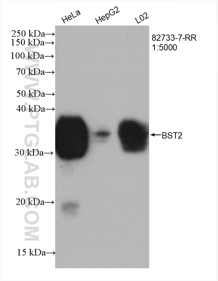The BST2 antibody from Proteintech is a rabbit recombinant antibody to a recombinant protein of human BST2. This antibody recognizes human antigen. The BST2 antibody has been validated for the following applications: WB, IF/ICC, FC (Intra), ELISA analysis.