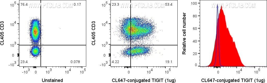 1x10^6?PBMC were stained with 1ug?CoraLite Plus 647 conjugated-TIGIT VHH (CL647-tgt)?and 5ul CoraLite Plus 405?conjugated Anti-Human CD3?(Clone:UCHT1; CL405-65151).?Lymphocytes were gated.