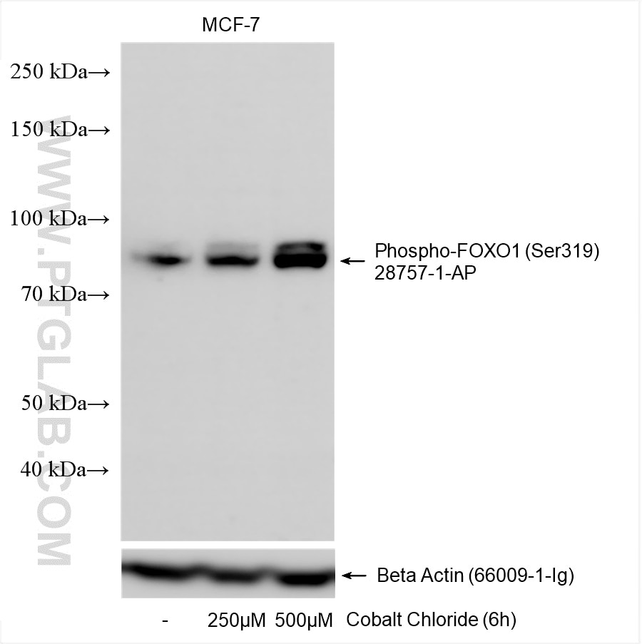 The Phospho-FOXO1 (Ser319) antibody from Proteintech is a rabbit polyclonal antibody to a peptide of human Phospho-FOXO1 (Ser319). This antibody recognizes human antigen. The Phospho-FOXO1 (Ser319) antibody has been validated for the following applications: WB, ELISA analysis.