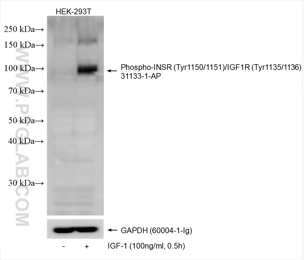 The Phospho-INSR (Tyr1150/1151)/IGF1R (Tyr1135/1136) antibody from Proteintech is a rabbit polyclonal antibody to a peptide of human Phospho-INSR (Tyr1150/1151)/IGF1R (Tyr1135/1136). This antibody recognizes human antigen. The Phospho-INSR (Tyr1150/1151)/IGF1R (Tyr1135/1136) antibody has been validated for the following applications: WB, ELISA analysis.