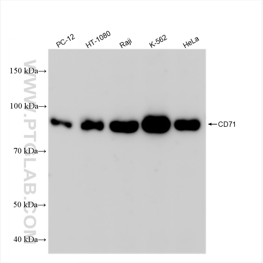 The CD71 antibody from Proteintech is a rabbit recombinant antibody to a recombinant protein of human CD71. This antibody recognizes human antigen. The CD71 antibody has been validated for the following applications: WB, IF/ICC, ELISA analysis.