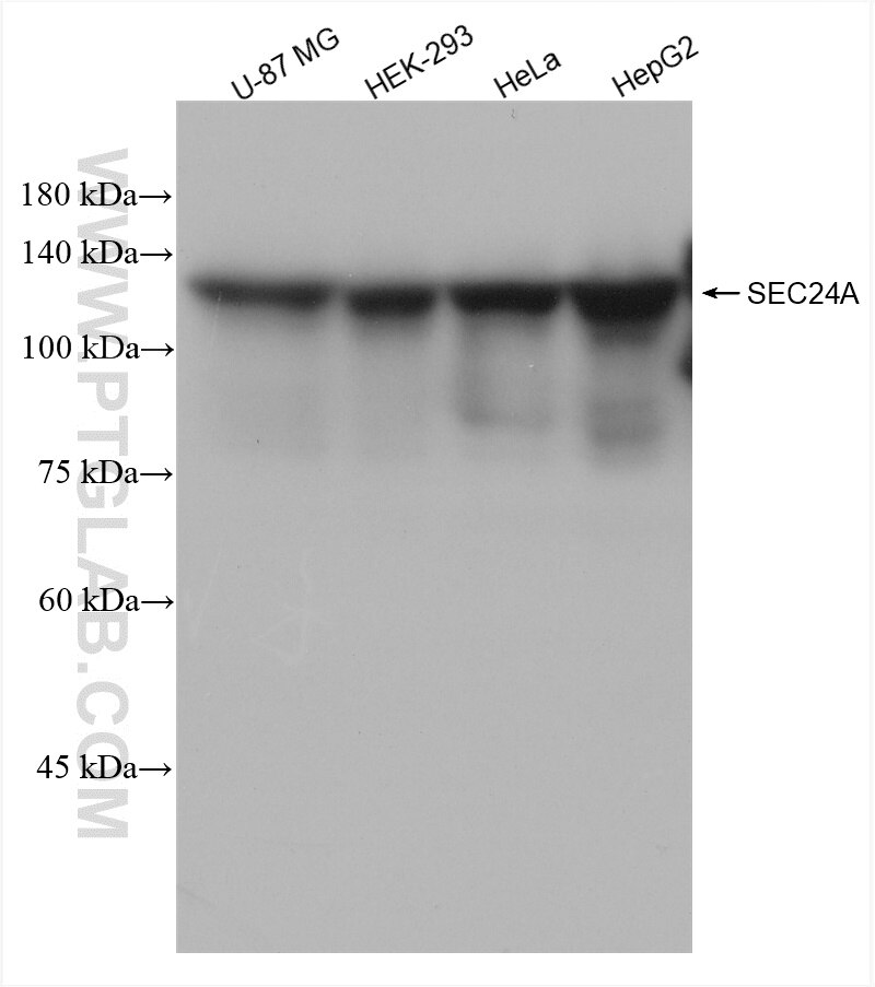 The SEC24A antibody from Proteintech is a rabbit recombinant antibody to a recombinant protein of human SEC24A. This antibody recognizes human antigen. The SEC24A antibody has been validated for the following applications: WB, IF/ICC, FC (Intra), ELISA analysis.