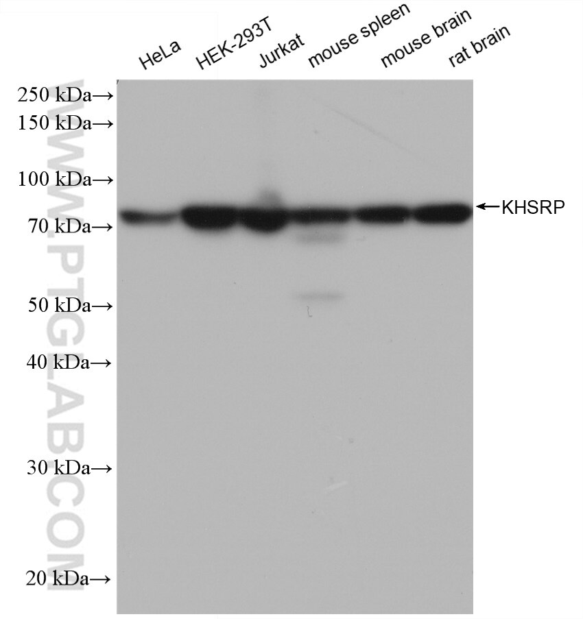 The KHSRP antibody from Proteintech is a rabbit recombinant antibody to a recombinant protein of human KHSRP. This antibody recognizes human, mouse, rat antigen. The KHSRP antibody has been validated for the following applications: WB, IHC, IF/ICC, FC (Intra), IP, ELISA analysis.