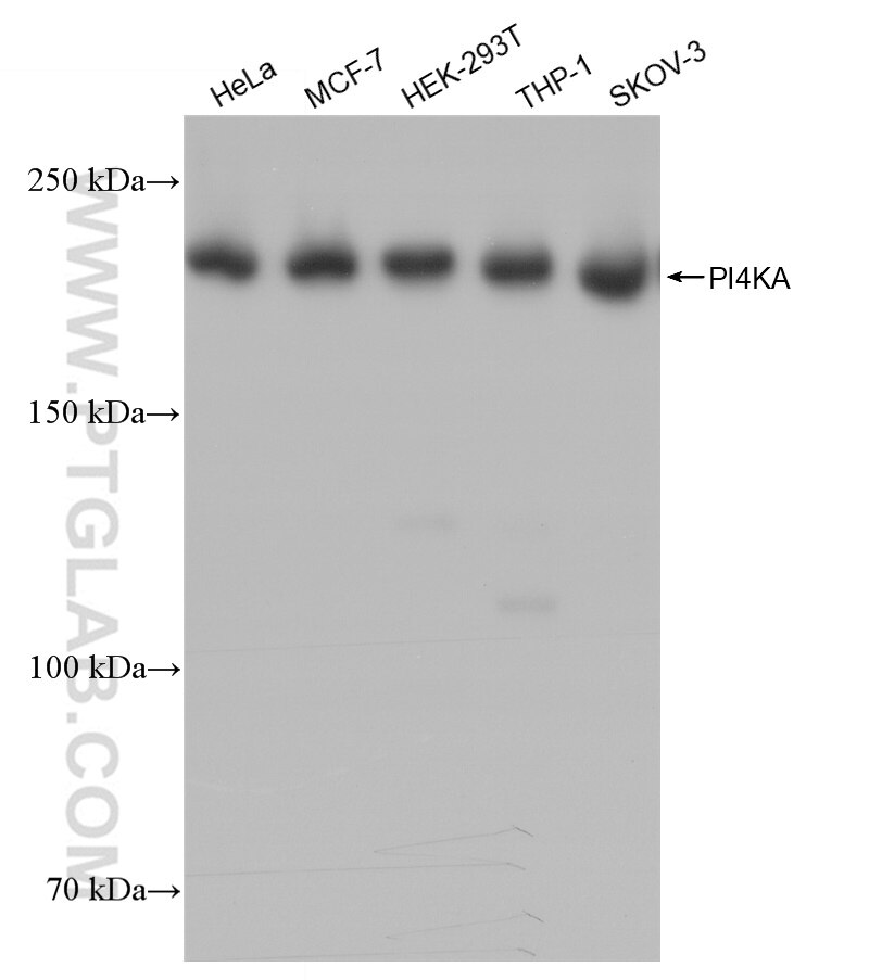 The PI4KA antibody from Proteintech is a rabbit recombinant antibody to a recombinant protein of human PI4KA. This antibody recognizes human, mouse, rat antigen. The PI4KA antibody has been validated for the following applications: WB, IHC, IF/ICC, FC (Intra), ELISA analysis.