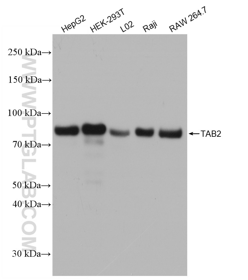 The TAB2 antibody from Proteintech is a rabbit recombinant antibody to a recombinant protein of human TAB2. This antibody recognizes human, mouse antigen. The TAB2 antibody has been validated for the following applications: WB, ELISA analysis.