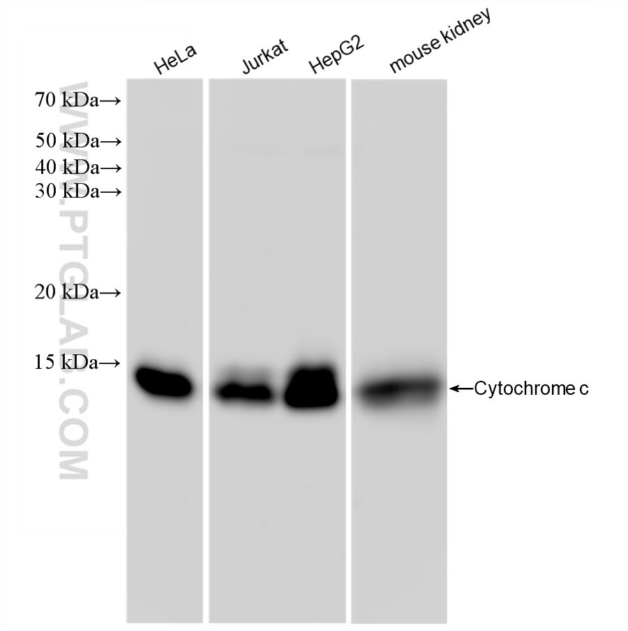 The Cytochrome c antibody from Proteintech is a rabbit recombinant antibody to a recombinant protein of human Cytochrome c. This antibody recognizes human, mouse antigen. The Cytochrome c antibody has been validated for the following applications: WB, IF/ICC, FC (Intra), ELISA analysis.