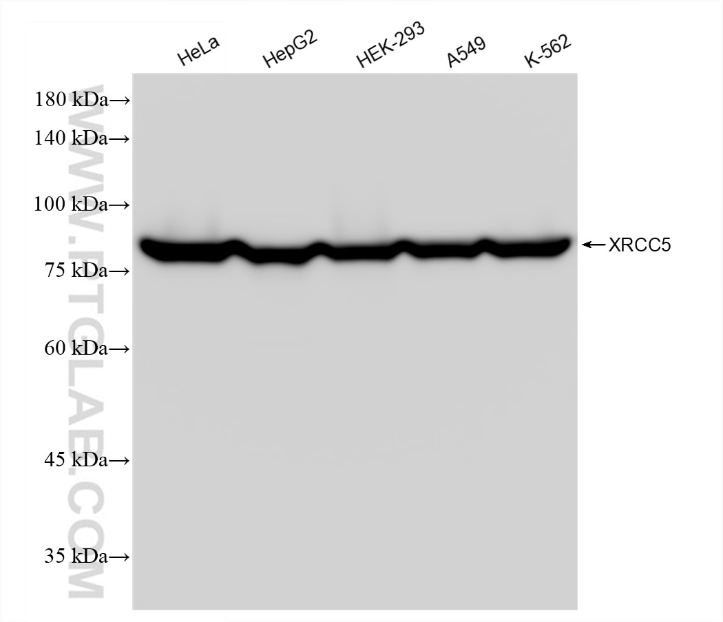The XRCC5/Ku80 antibody from Proteintech is a rabbit recombinant antibody to a recombinant protein of human XRCC5/Ku80. This antibody recognizes human antigen. The XRCC5/Ku80 antibody has been validated for the following applications: WB, IHC, IF/ICC, FC (Intra), ELISA analysis.