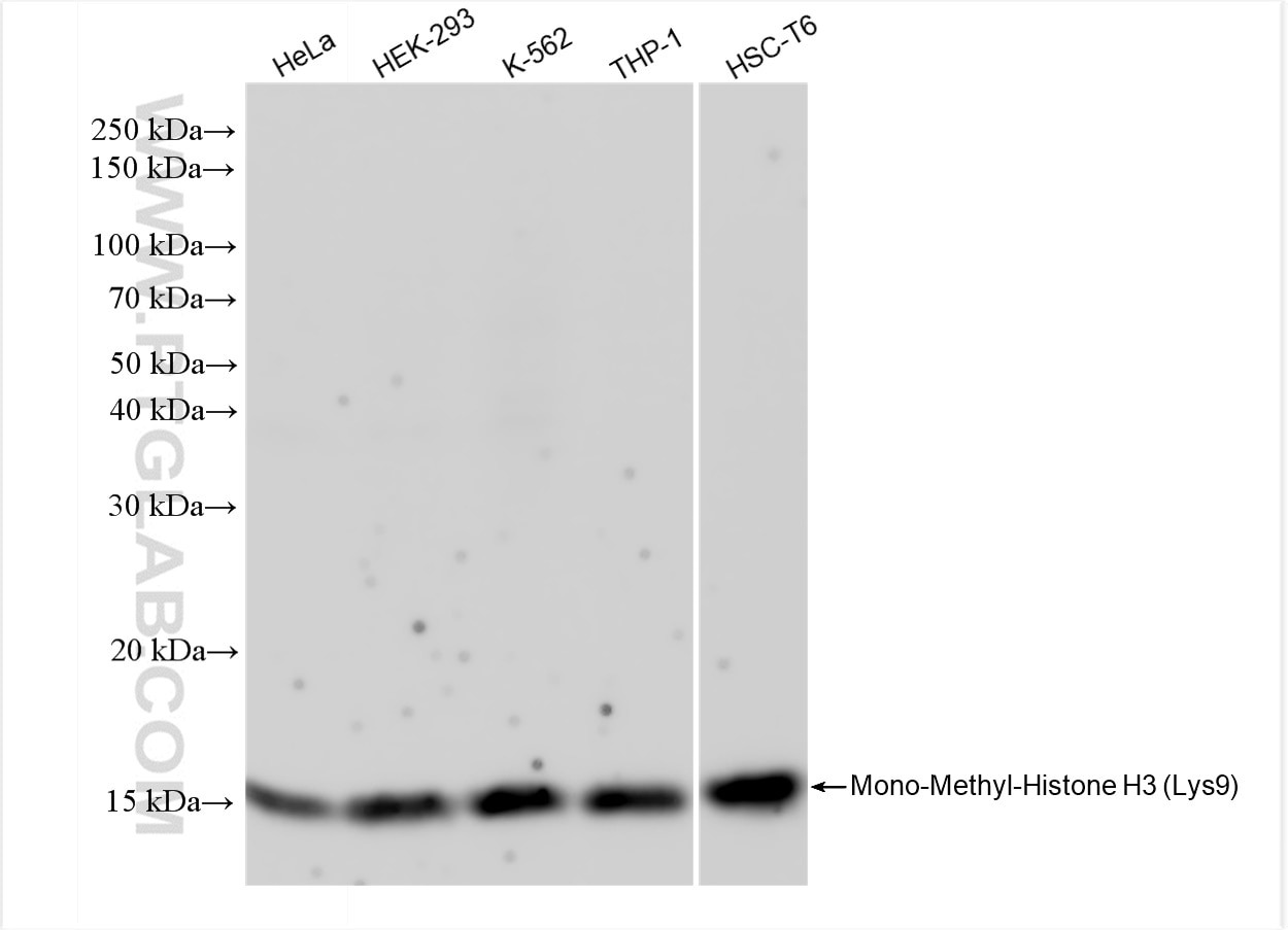 The Mono-Methyl-Histone H3 (Lys9) antibody from Proteintech is a rabbit recombinant antibody to a peptide of human Mono-Methyl-Histone H3 (Lys9). This antibody recognizes human, rat antigen. The Mono-Methyl-Histone H3 (Lys9) antibody has been validated for the following applications: WB, Dot Blot, ELISA analysis.