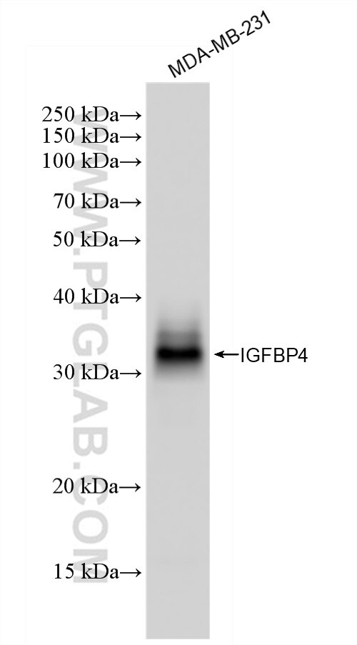 The IGFBP4 antibody from Proteintech is a rabbit recombinant antibody to a fusion protein of human IGFBP4. This antibody recognizes human antigen. The IGFBP4 antibody has been validated for the following applications: WB, IHC, FC (Intra), ELISA analysis.