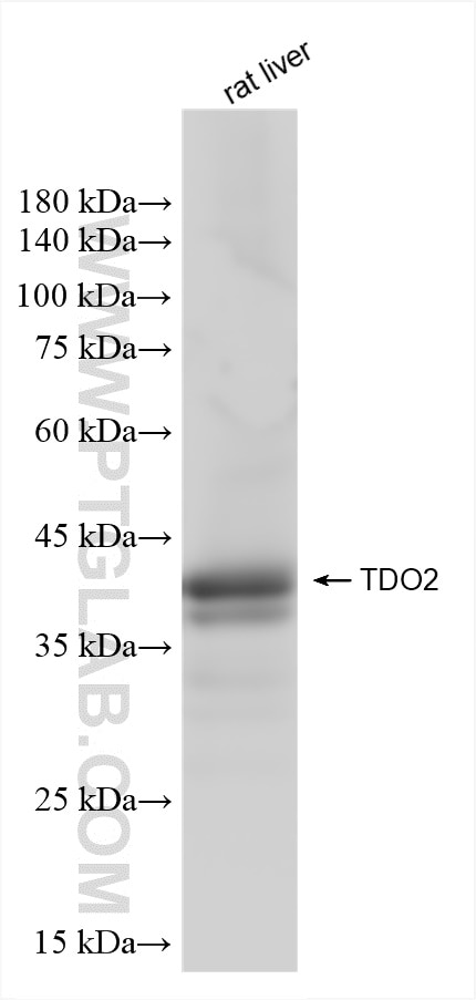 The TDO2 antibody from Proteintech is a rabbit recombinant antibody to a recombinant protein of human TDO2. This antibody recognizes human, rat antigen. The TDO2 antibody has been validated for the following applications: WB, ELISA analysis.