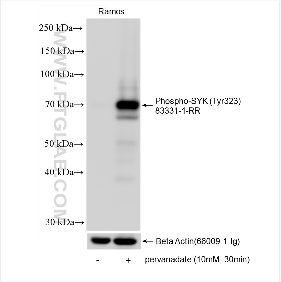 The Phospho-SYK (Tyr323) antibody from Proteintech is a rabbit recombinant antibody to a peptide of human Phospho-SYK (Tyr323). This antibody recognizes human antigen. The Phospho-SYK (Tyr323) antibody has been validated for the following applications: WB, IF/ICC, ELISA analysis.