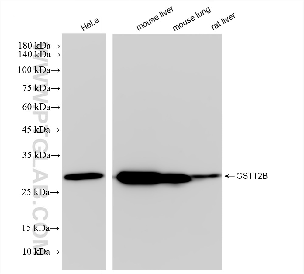 The GSTT2B antibody from Proteintech is a rabbit recombinant antibody to a fusion protein of human GSTT2B. This antibody recognizes human, mouse, rat antigen. The GSTT2B antibody has been validated for the following applications: WB, ELISA analysis.