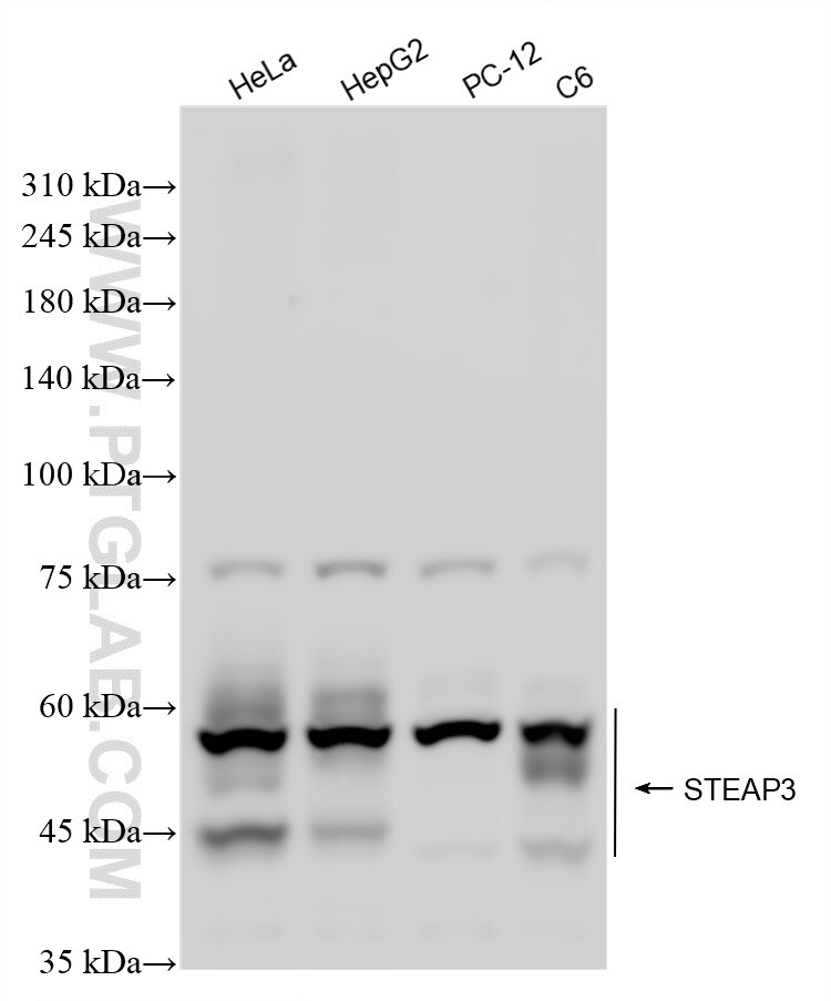 The STEAP3 antibody from Proteintech is a rabbit recombinant antibody to a recombinant protein of human STEAP3. This antibody recognizes human, rat antigen. The STEAP3 antibody has been validated for the following applications: WB, FC (Intra), ELISA analysis.