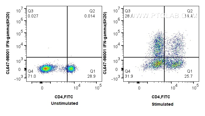 The IFN-gamma antibody from Proteintech is a rabbit recombinant antibody to a recombinant protein of rat IFN-gamma. This antibody recognizes rat antigen. The IFN-gamma antibody has been validated for the following applications: FC (Intra) analysis. This antibody is coraliteR plus 647.
