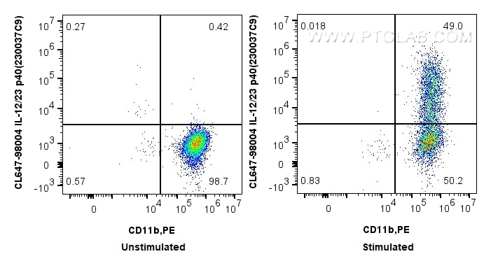 The IL-12/IL-23 p40 antibody from Proteintech is a rabbit recombinant antibody to a recombinant protein of mouse IL-12/IL-23 p40. This antibody recognizes mouse antigen. The IL-12/IL-23 p40 antibody has been validated for the following applications: FC (Intra) analysis. This antibody is coraliteR plus 647.