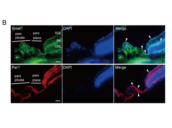 Immunohistochemical analysis in the retina and ciliary body of C57BL/6J mice. (A) Adrenergic β2-receptors (Adrb2) and glucocorticoid receptor (GR) immunoreactivity in the retina and ciliary body of C57BL/6J mice. (B) Immunoreactivity of clock protein Bmal1 and Per1 in the retina and ciliary body of C57BL/6J mice. Fluorescence immunohistochemistry revealed that immunoreactivity (white arrowhead) localized in the epithelia of the ciliary body. Scale bar: 100 μm. DAPI, 4',6-diamidino-2-phenylindole. RGL, retinal ganglion cell layer; INL, inner nuclear layer; ONL, outer nuclear layer. Fig. S4. PMID: 32182332.