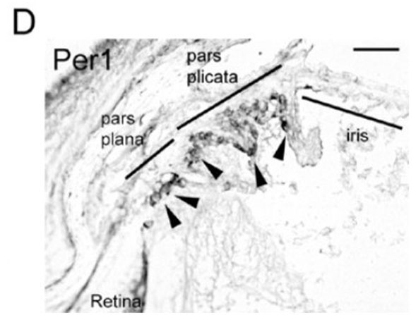 Localizations of GR, Adrb2, and Bmal1 in the ciliary body. Representative images of (A) GR, (B) adrenergic β2-receptors (Adrb2), (C) Bmal1, and (D) Per1 immunoreactivity in the retina and ciliary body of albino Balb/c mice by immunohistochemistry. Strong immunoreactivity (arrowhead) was seen in the pars plana of the ciliary body. Scale bar: 100?μm. CPE, ciliary pigmented epithelium; INL, inner nuclear layer; ONL, outer nuclear layer; RGL, retinal ganglion cell layer; TM, trabecular meshwork. Figure 3. PMID: 32182332.