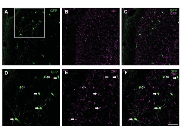 Analysis of corticotropin-releasing factor (CRF)-expressing interneurons in the cingulate cortex of FVB-Tg(GadGFP)45704Swn/J mice. A?C: Representative confocal images of cells in the cingulate cortex immunopositive for GFP (green) and CRF (magenta). The white square in A represents the area that is shown at higher magnification in D?F. D?F: Detailed analysis of CRF expression in GFP 1 cells in the cingulate gyrus. Solid white arrows indicate GFP1/CRF 1 cells and open white arrows GFP1/CRF2 cells. Note the widespread CRF 1 punctae throughout cells in layers II?III of the cingulate cortex. Scale bar in F 5 50 lm for A?C; 25 lm for D?F. Figure 9. PMID: .26669716