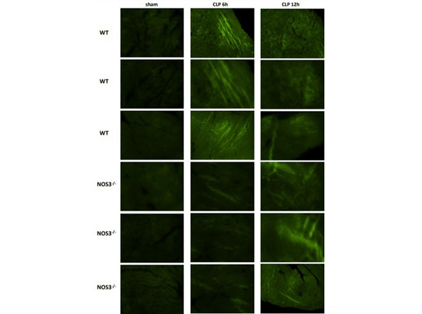 Immunohistochemistry. NOS3 increases 3-nitrotyrosine content in heart tissue in developing sepsis. Immunohistochemical staining demonstrated an increase of nitrotyrosine in heart tissue of septic wildtype mice at 6 hours post CLP, whereas no differences could be detected in NOS3-/- mice. Heart samples were fixed in 4% formaldehyde phosphate buffer, dehydrated and paraffin-embedded. For 3-nitrotyrosin detection serial sections (3 per mouse, 400μm apart) were incubated with a polyclonal antibody raised against nitrotyrosine, followed by sheep anti-rabbit IgG conjugated to DyLight?488 (p/n 611-641-122).Figure online resource 1. PMID: 23397596.