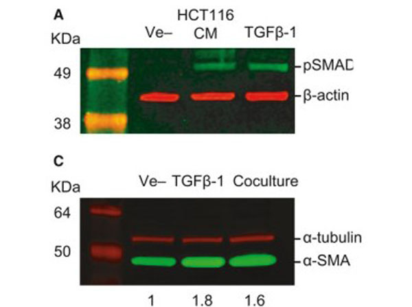 TGF‐β‐mediated crosstalk between pericytes and CRC cells modulates pericyte secretome. (A) Incubation in HCT116 CM for 1?h induces SMAD3 phosphorylation in PC, as assessed by western blot. Exogenous recombinant TGF‐β (10?ng・mL−1) was used as a positive control, and β‐actin was used as loading control (n?=?3).Primary antibodies used anti‐human p‐SMAD3 antibody rabbit polyclonal (#600‐401‐919), anti‐human α‐SMA mouse monoclonal antibody, anti‐human β‐actin rabbit polyclonal, or anti‐human α‐tubulin mouse monoclonal antibody. Secondary antibodies used: DyLight 800‐conjugated anti‐rabbit or anti‐mouse antibody and DyLight 680‐conjugated anti‐rabbit or anti‐mouse antibody. Fig 5. PMID: 32767843.