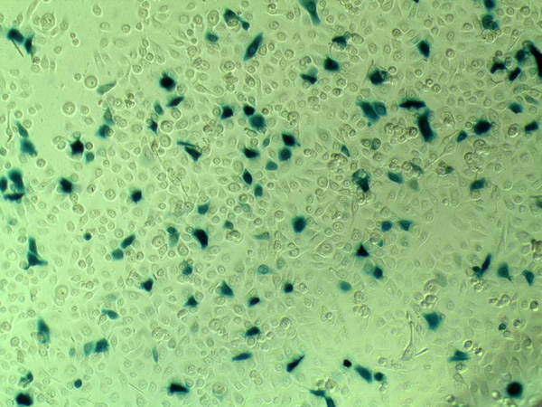 Kerafectagen [KeraF]:HEKs expressing β-galactosidase after transfection using KeraFectagen.