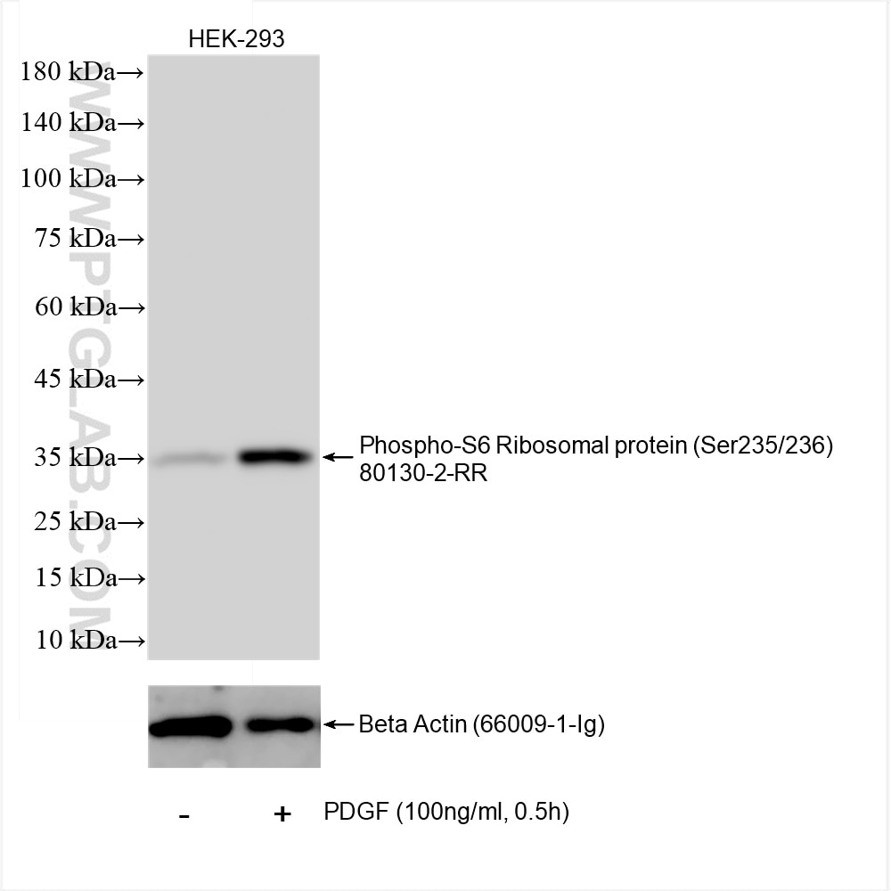 The Phospho-S6 Ribosomal protein (Ser235/236) antibody from Proteintech is a rabbit recombinant antibody to a peptide of human Phospho-S6 Ribosomal protein (Ser235/236). This antibody recognizes human, mouse, rat antigen. The Phospho-S6 Ribosomal protein (Ser235/236) antibody has been validated for the following applications: WB, IF/ICC, FC (Intra), ELISA analysis.