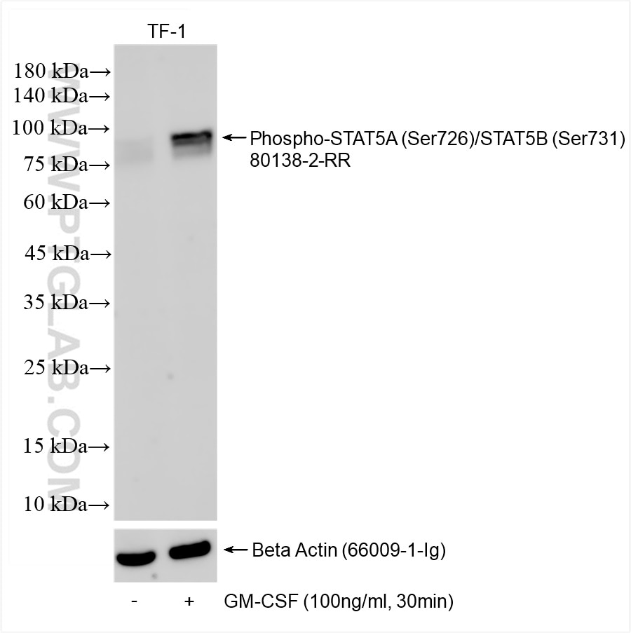 The Phospho-STAT5A (Ser726)/STAT5B (Ser731) antibody from Proteintech is a rabbit recombinant antibody to a peptide of human Phospho-STAT5A (Ser726)/STAT5B (Ser731). This antibody recognizes human antigen. The Phospho-STAT5A (Ser726)/STAT5B (Ser731) antibody has been validated for the following applications: WB, IF/ICC, FC (Intra), ELISA analysis.