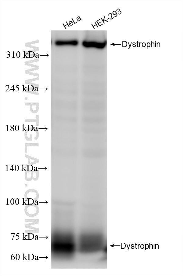 The Dystrophin antibody from Proteintech is a rabbit recombinant antibody to a recombinant protein of human Dystrophin. This antibody recognizes human, mouse, rat antigen. The Dystrophin antibody has been validated for the following applications: WB, IHC, IF/ICC, IF-P, FC (Intra), ELISA analysis.