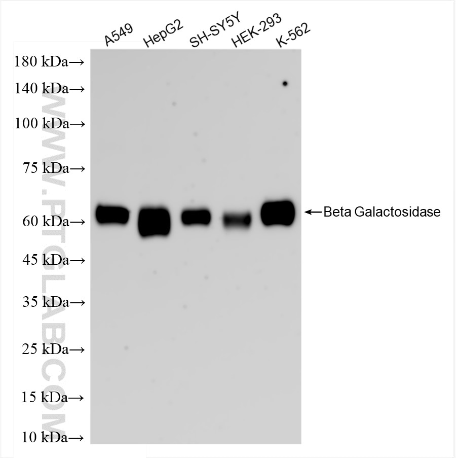 The Beta galactosidase antibody from Proteintech is a rabbit recombinant antibody to a fusion protein of human Beta galactosidase. This antibody recognizes human antigen. The Beta galactosidase antibody has been validated for the following applications: WB, IF/ICC, FC (Intra), ELISA analysis.