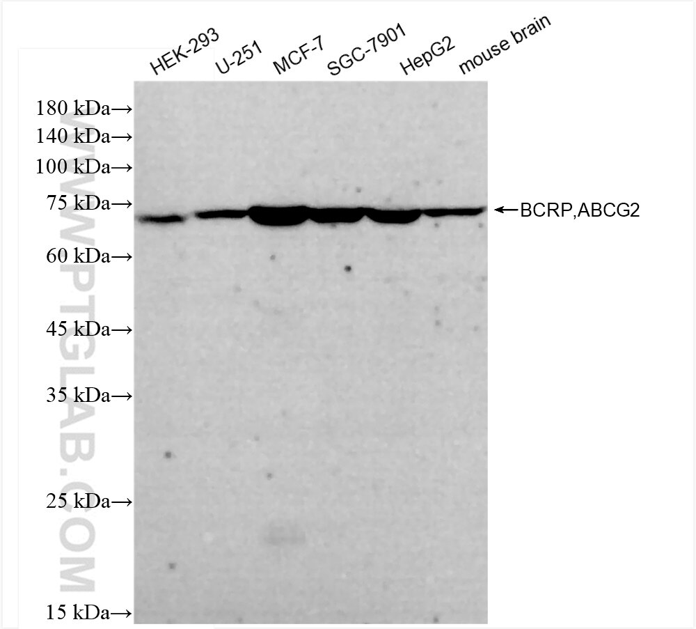 The BCRP/ABCG2 antibody from Proteintech is a rabbit recombinant antibody to a fusion protein of human BCRP/ABCG2. This antibody recognizes human, mouse antigen. The BCRP/ABCG2 antibody has been validated for the following applications: WB, ELISA analysis.