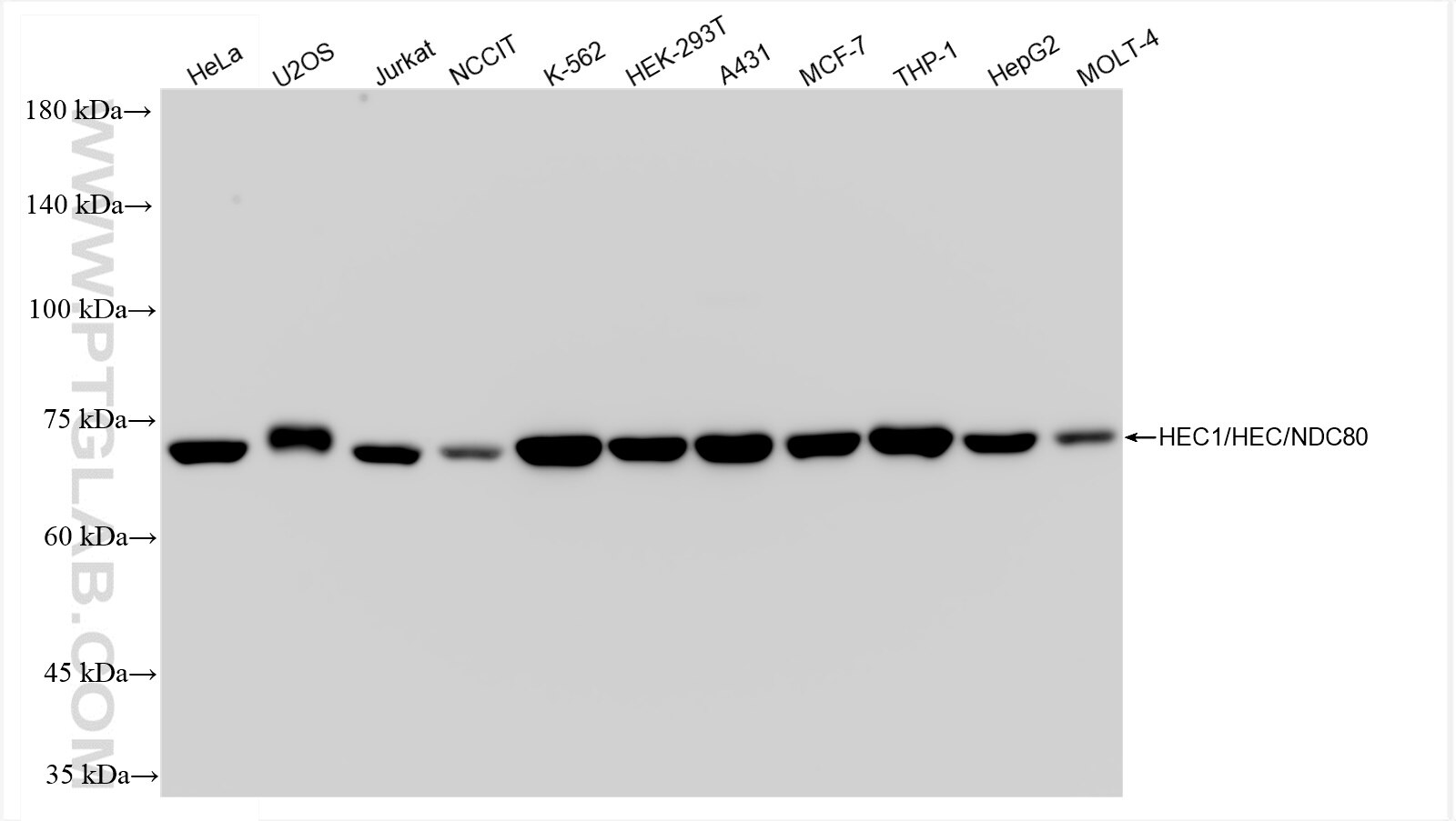 The HEC1/HEC/NDC80 antibody from Proteintech is a rabbit recombinant antibody to a recombinant protein of human HEC1/HEC/NDC80. This antibody recognizes human antigen. The HEC1/HEC/NDC80 antibody has been validated for the following applications: WB, IF/ICC, FC (Intra), ELISA analysis.