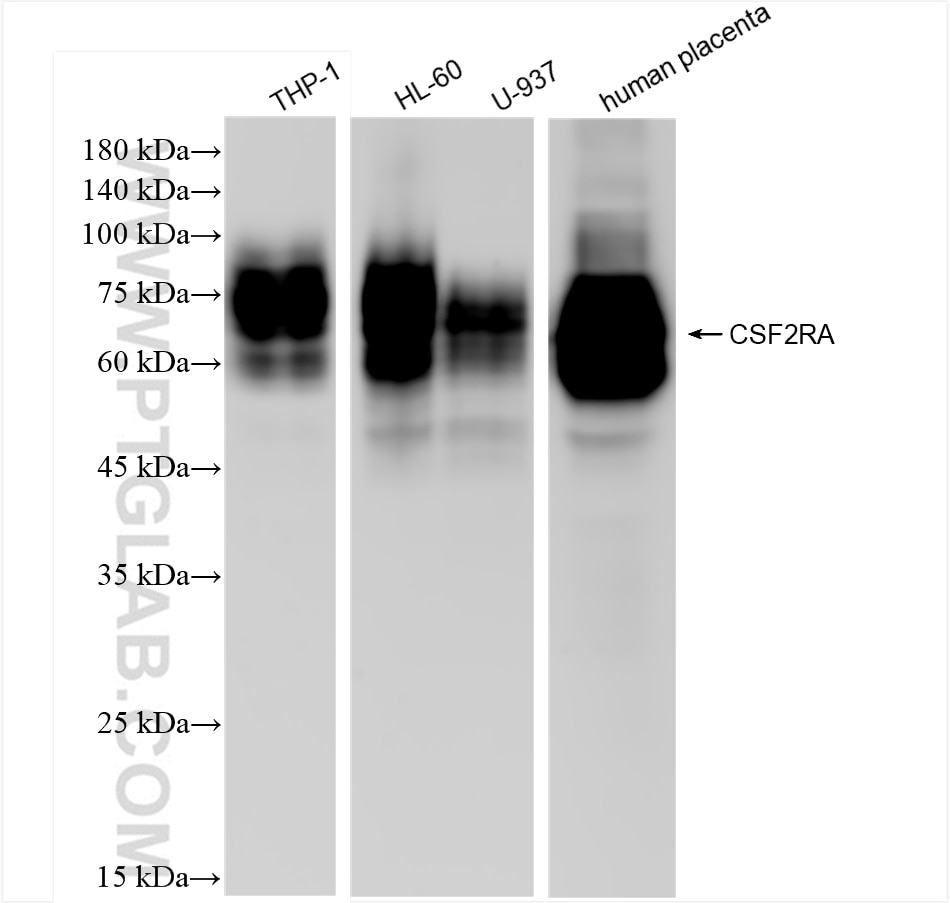 The CSF2RA/CD116 antibody from Proteintech is a rabbit recombinant antibody to a recombinant protein of human CSF2RA/CD116. This antibody recognizes human antigen. The CSF2RA/CD116 antibody has been validated for the following applications: WB, IHC, IF/ICC, ELISA analysis.