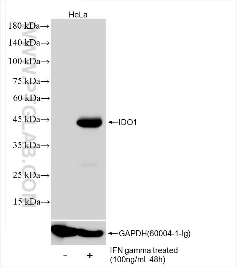 The IDO1 antibody from Proteintech is a rabbit recombinant antibody to a fusion protein of human IDO1. This antibody recognizes human antigen. The IDO1 antibody has been validated for the following applications: WB, FC (Intra), ELISA analysis.