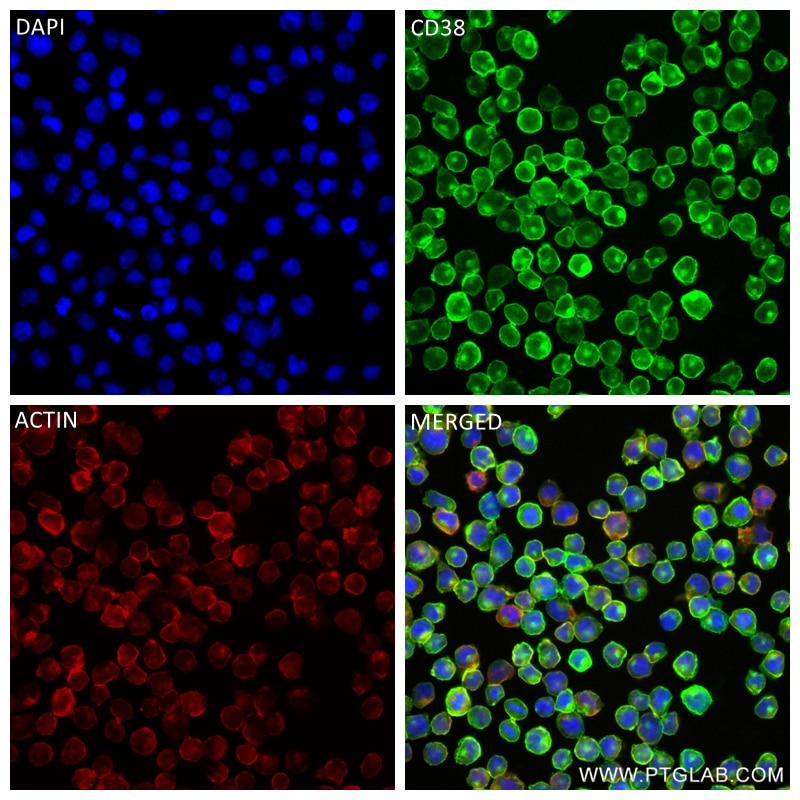 The CD38 antibody from Proteintech is a rabbit recombinant antibody to a fusion protein of human CD38. This antibody recognizes human antigen. The CD38 antibody has been validated for the following applications: IF/ICC, ELISA analysis.
